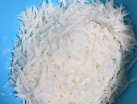 制作过程:第一步:把虾皮跟白萝卜洗干净,把白萝卜外表的皮给削掉,然后刨成丝,放在沸水中焯两分钟就捞出来,等晾凉之后把萝卜中的水分给挤干净;
