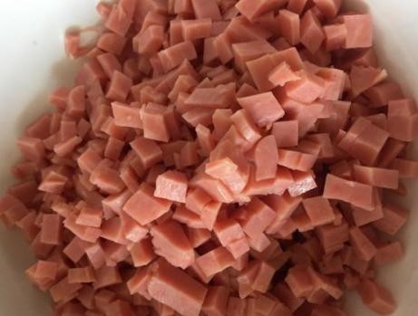 第二步:把香肠切成小丁装到一个小碗里,并且在锅中热水;
