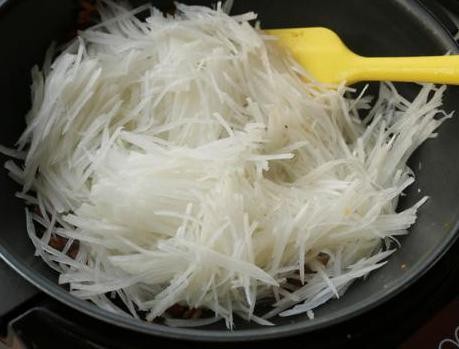 第三步:在炒锅中倒入适量的食用油,把香肠丁跟虾皮倒入锅中干煸,再把萝卜丝倒进去翻炒;