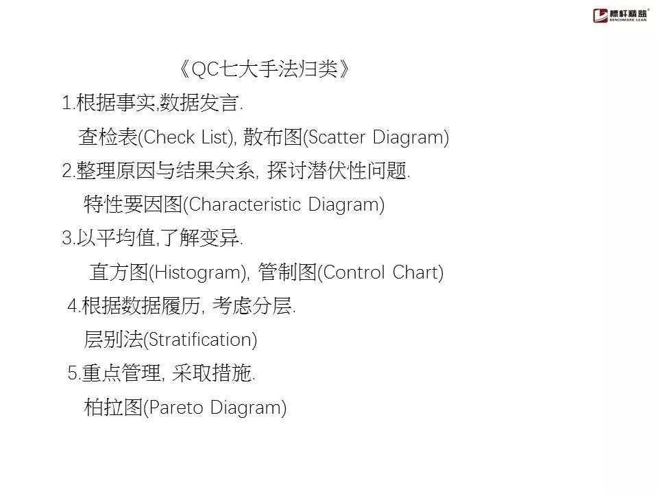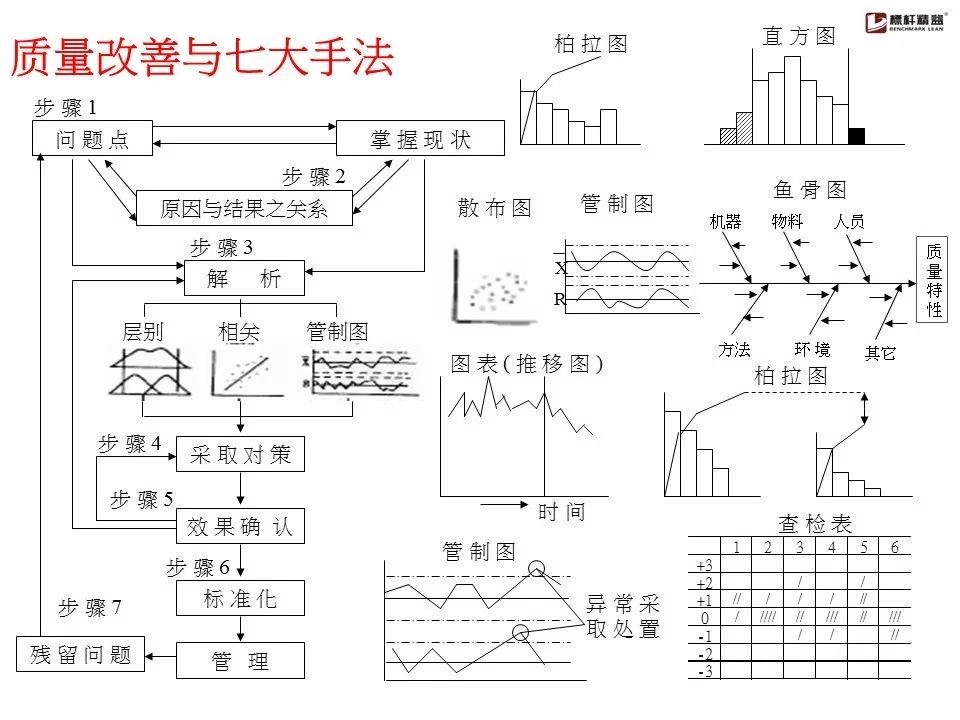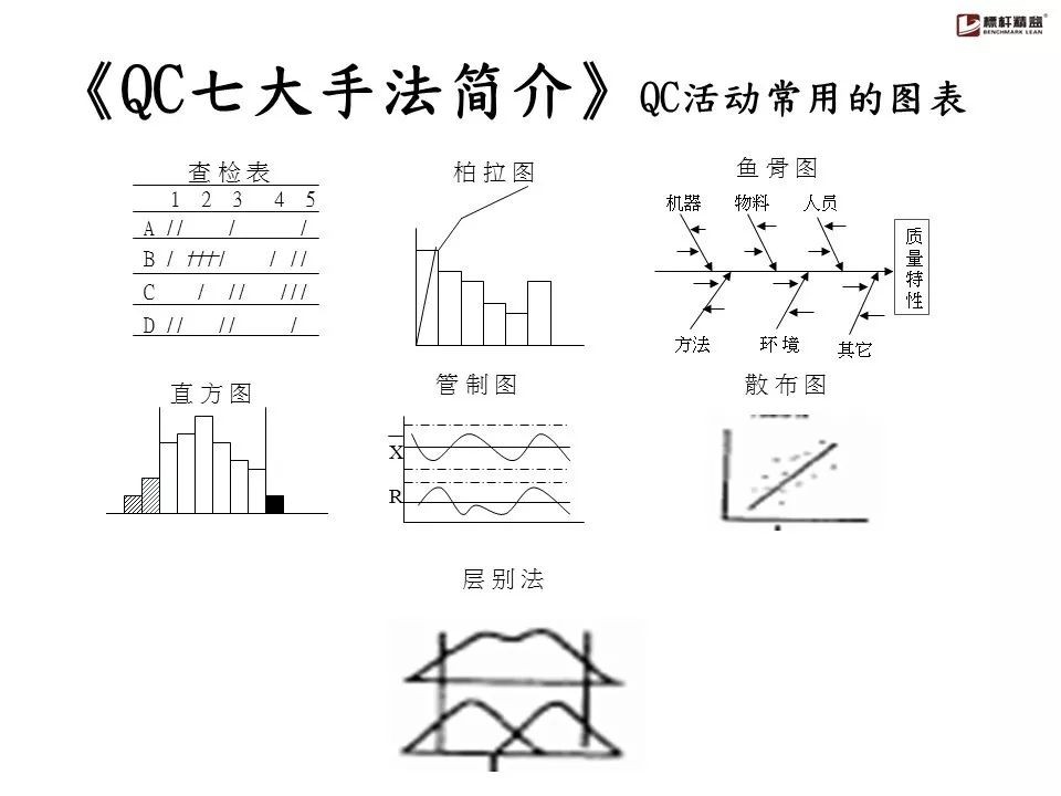 本文总共介绍了QC活动常用的7种图表:查检表、柏拉图、鱼骨图、直方图、管制图、层别法,以及QC手法的基本作用,希望各位益友从中获益,学以致用!