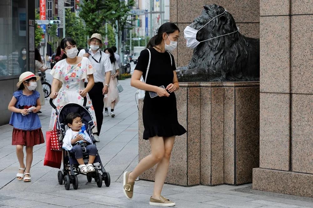Pedestrians wearing protective masks walk past a statue with a mask on in front of a department store amid the COVID-19 pandemic in Tokyo, Japan, August 18, 2020. /Reuters