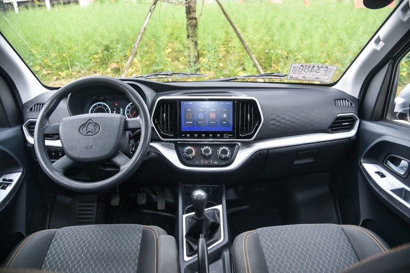 内饰设计方面,新长安星卡配备7寸的中控大屏,支持倒车影像、手机映射、倒车雷达、蓝牙等功能,中控台采用黑色和高光钢琴烤漆风格材质装饰板,座椅也采用浅灰和黑色双色搭配,主驾座椅可前后滑动+靠背调节,前排座椅可放平。