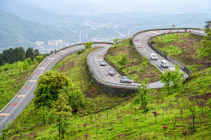 此次我们试驾的道路是綦江横山九道拐,从山脚到山顶全长14公里,高度落差711米,最陡坡度32.5度,蜿蜒曲泽,全程坡道。对于载人载货的商用车,是个不小的考验。