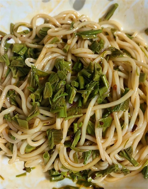 3. 拌制:将面条放入大碗中,倒入调好的酱汁,用筷子快速挑拌均匀。然后加入处理好的香椿碎,再次拌匀。