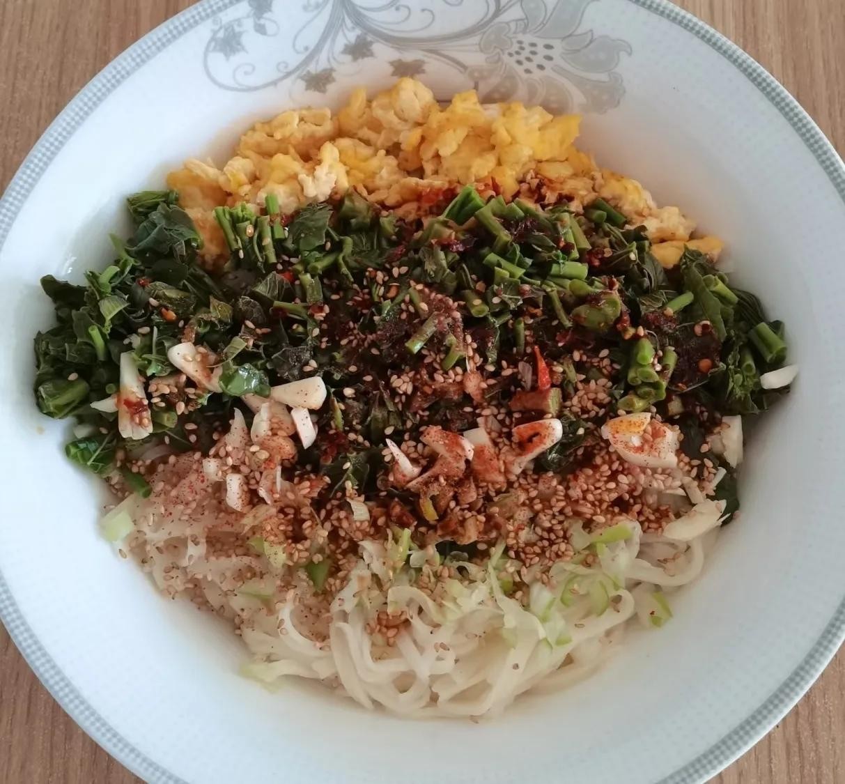 4. 装盘:将拌好的面条装入碗中,可以根据喜好撒上一些花生碎、白芝麻或香菜末增加口感和视觉效果。