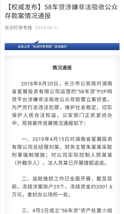 三湘都市报6月11日讯 今天,长沙市打非办旗下的政务微信号“长沙打非专线”发布公告,通报了“58车贷”P2P网贷平台涉嫌非法吸收公众存款案件的最新进展情况。
