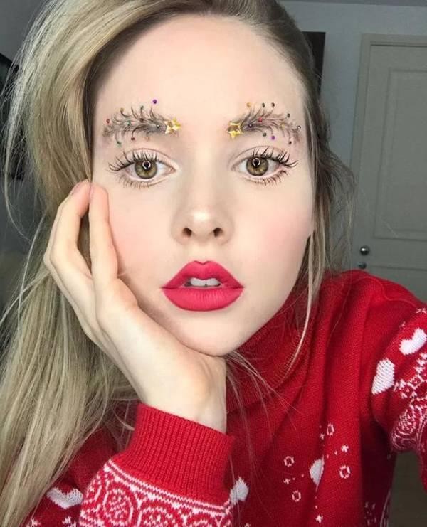 发明这款圣诞眉毛的姑娘是一名加拿大美容师,因为圣诞节的到来,她决定将眉毛画成圣诞树的模样。闪亮的亮片,圣诞树形状的眉型让自己的额头也有了节日的气氛。