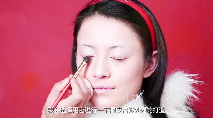 Step2:选择珠光粉色系眼影,大面积的涂抹在眼皮上,进行眼妆的打底。