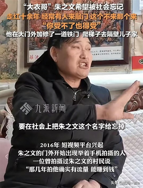 短视频平台兴起,让无数人找到了财富密码,却也让大衣哥陷入另一个怪圈,一大批人举着手机,像饿狼盯着猎物一样,时刻记录着朱之文一家人的生活,以此谋利,更有甚者,将大衣哥当做噱头,试图吸引更多关注。