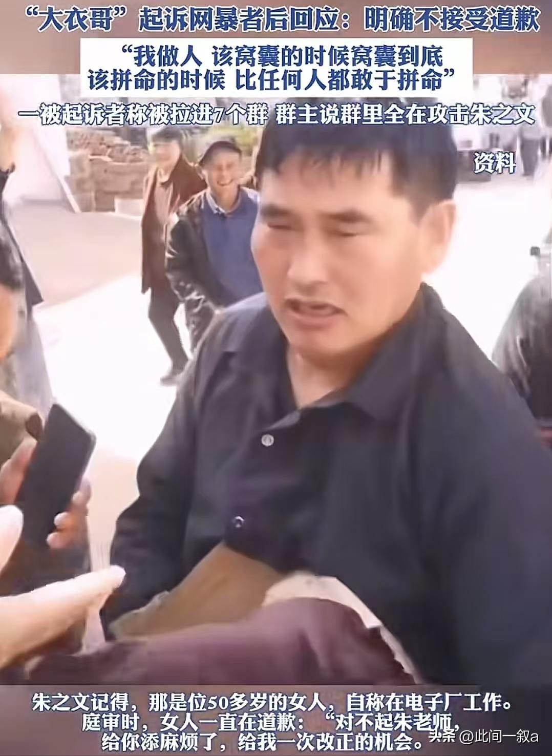 这其实不是大衣哥第一次起诉网暴者,而是第四次,之前三位网暴者分别被判四年、一年三个月、还有监外执行,其中一人曾主动到朱之文家中下跪致歉,又是托人说好话,又是主动扇耳光,但朱之文并没有心软,他就是想让这些人知道:网上不是法外之地!