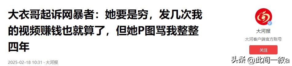 大河报:2025年2月18日《大衣哥起诉网暴者:她要是穷,发几次我的视频赚钱也就算了,但她P图骂我整整四年》