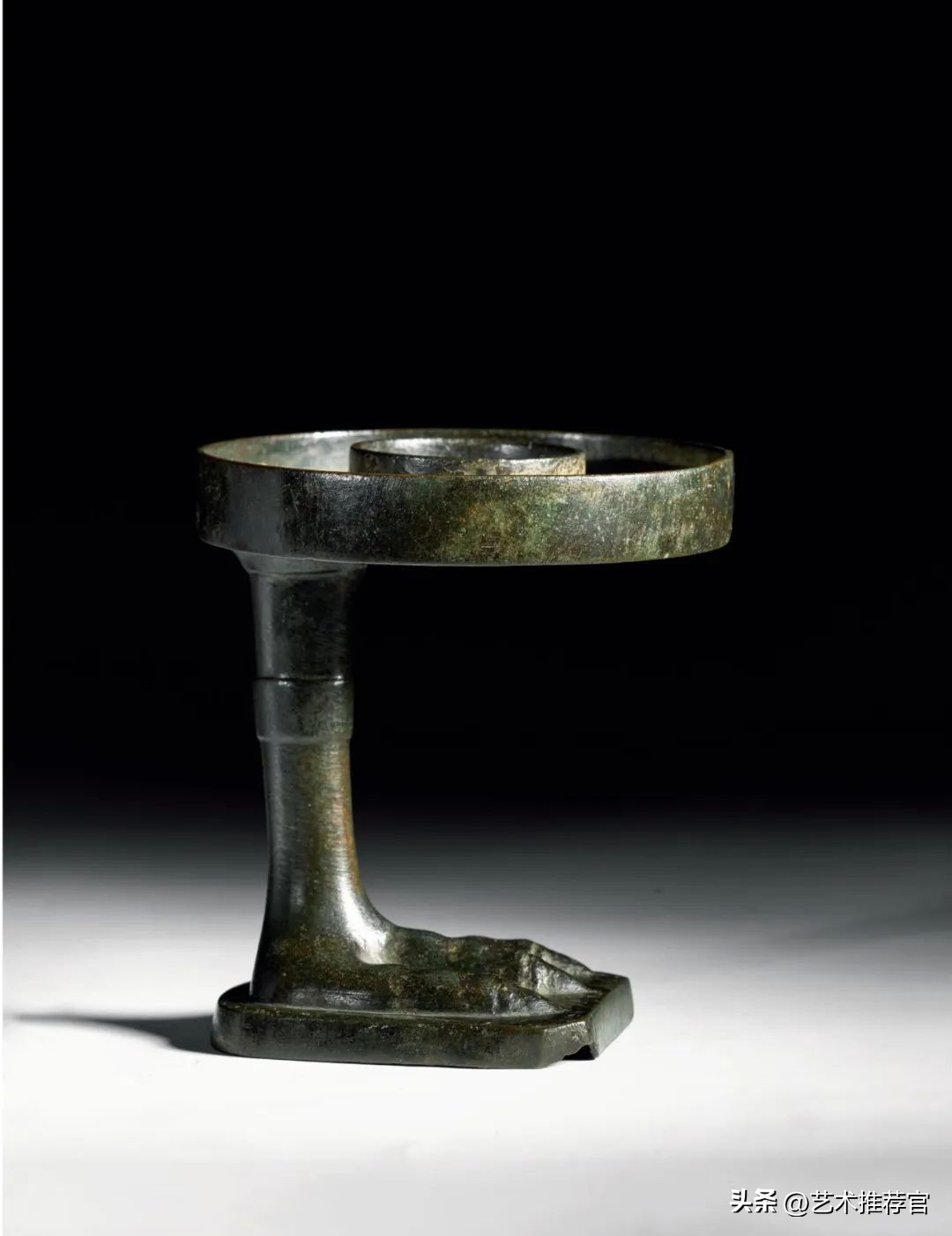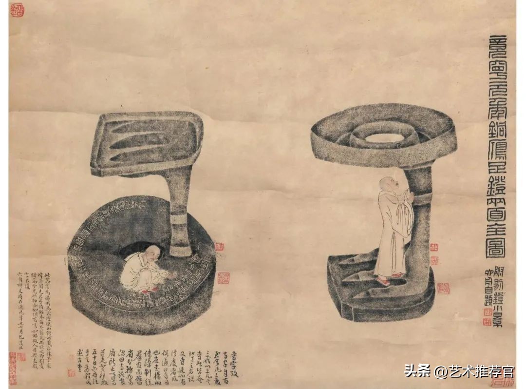 清道光年间,藏家程洪溥多次邀请僧人六舟——全形拓技艺发展中的代表人物,为其千余件青铜器传拓。久负盛名的《剔灯图》便诞生于此期间。卷中央为西汉竟宁元年雁足灯全形拓,一倒一正并置。倒立的灯身上有缩小化的六舟小像,俯身于灯盘底部剔洗铭文。正立灯身上六舟小像站于灯足上作摩挲状。