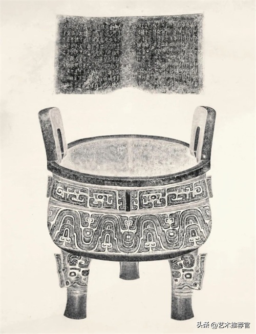 大克鼎器型雄壮威武,纹饰高低错落,风格粗犷、质朴。鼎腹内壁铸铭文二百九十字,是研究西周社会政治、经济的重要资料,也是西周书法艺术中的皇皇巨篇。拓本上方为大克鼎铭文拓片,下方为大克鼎全形拓,正面俯视构图,器身内壁为大克鼎局部铭文。