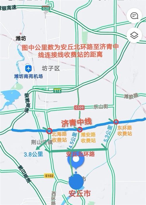 济青中线济潍段连接线经过安丘开发区北部,在北海路马司村东南、潍安路张疃村、东环路前曹村西设三个出入口,虽不在安丘地界,但距出入口都非常近,上下高速非常方便,届时,安丘将形成济潍、潍日、潍青三条高速北、西、南三面环绕,成为济南、青岛之间重要的节点枢纽城市。