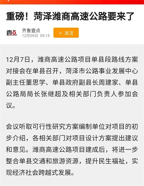 2020年12月7日,潍商高速单县段已召开线路方案对接会。