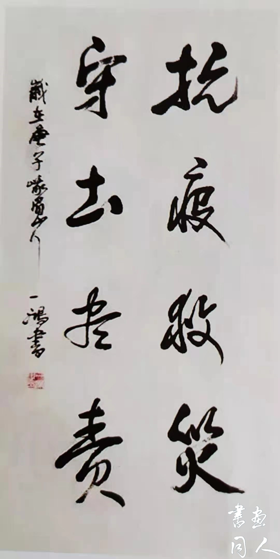 “苟利国家生死以,岂因福祸避趋之”——为国为民舍生取义的大无畏精神在一鸿书作《抗疫救灾守土尽责》中体现得淋漓尽致:起笔凝重,落笔果敢坚毅,收笔洒脱从容,让人不由得眼前浮现出白衣执甲,逆行出征的抗疫人因义而勇的铮铮风骨。