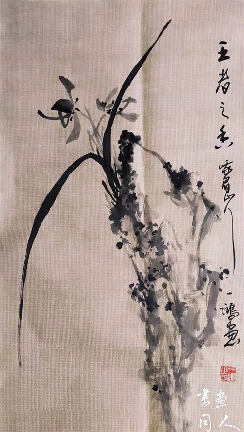寥寥两笔发散着无尽韵味,是兰叶亦是劲笔所书之“人”。画中,兰花所处空灵高远,兰叶苍翠、雄秀,花蕊傲然而放;兰根所附以淡墨写意,似是奇山飞鸿又如幻境云烟,让人浮想联翩:许是道之逍遥缥缈;许是“君子之于天下也,无适也,无莫也,义之与比”。