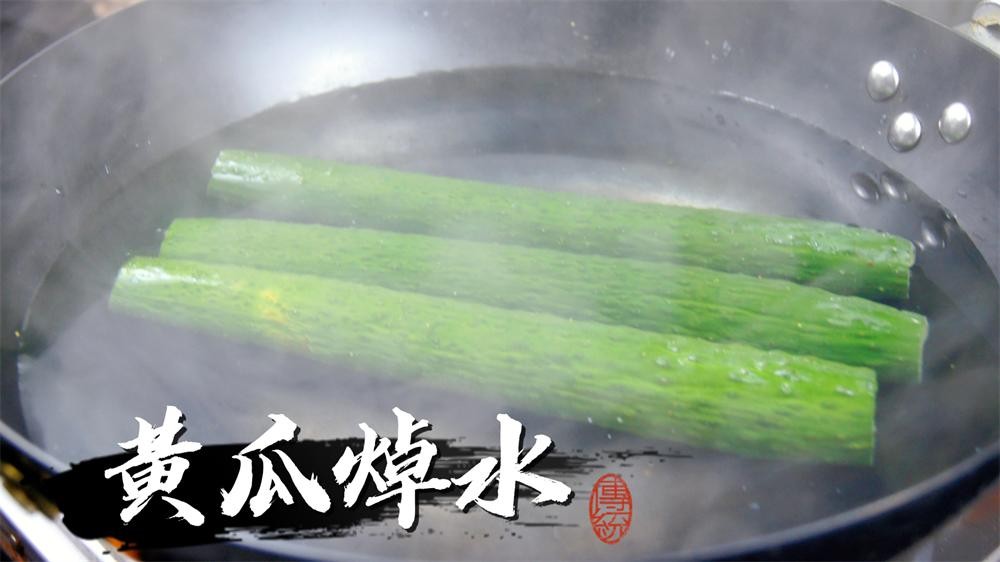 将黄瓜清洗干净之后切掉头尾,接着起锅烧水,往锅中加入清水烧开至沸腾,然后再将洗好的黄瓜放入开水中,我们给它焯一遍水。这一步也是不能少的,焯过水的黄瓜待会儿做凉拌的时候,不仅颜色翠绿好看,去了青涩味的黄瓜口感会更清爽,更好吃。大约120秒左右就可以沥水捞出。