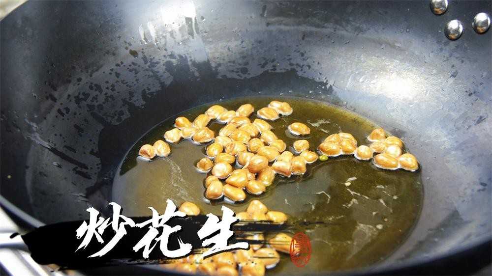 黄瓜处理完成之后,我们就继续起锅,然后往锅中加入少量的食用油,再将准备好的花生在油温微热的时候下入锅中炒,这个过程一定是要小火慢炒,这样可以防止花生炒糊,糊了的花生就会有苦味,这样就不好吃了。花生炒成棕黄色的花生米就可以沥油出锅装盘备用了。