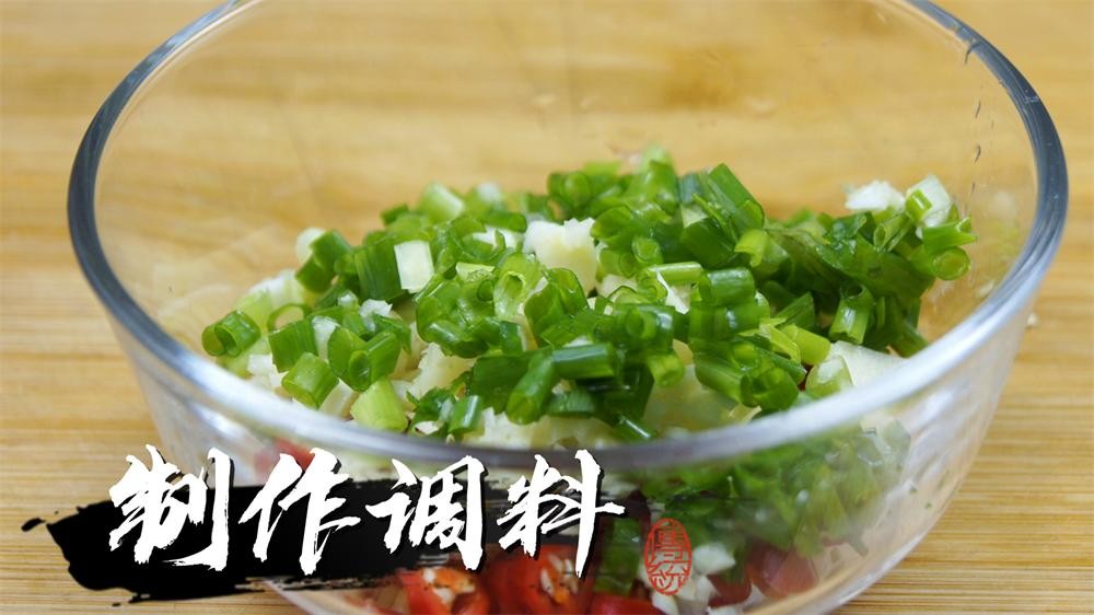 接着我们需要调一个配料,先将小米辣椒清洗干净,之后切成辣椒圈,再将大蒜、小葱切成小一点的沫。切好装进有辣椒的小碗中,锅中加入少量的食用油,待油热之后,再将热油浇到碗中的,这样葱蒜的香味就被热油激发出来了。接着我们再给配料调个味,往碗中加入适量的食用盐、生抽、蚝油、香醋、香油,这个调料品的量,大家可以根据自己的口味自行添加。