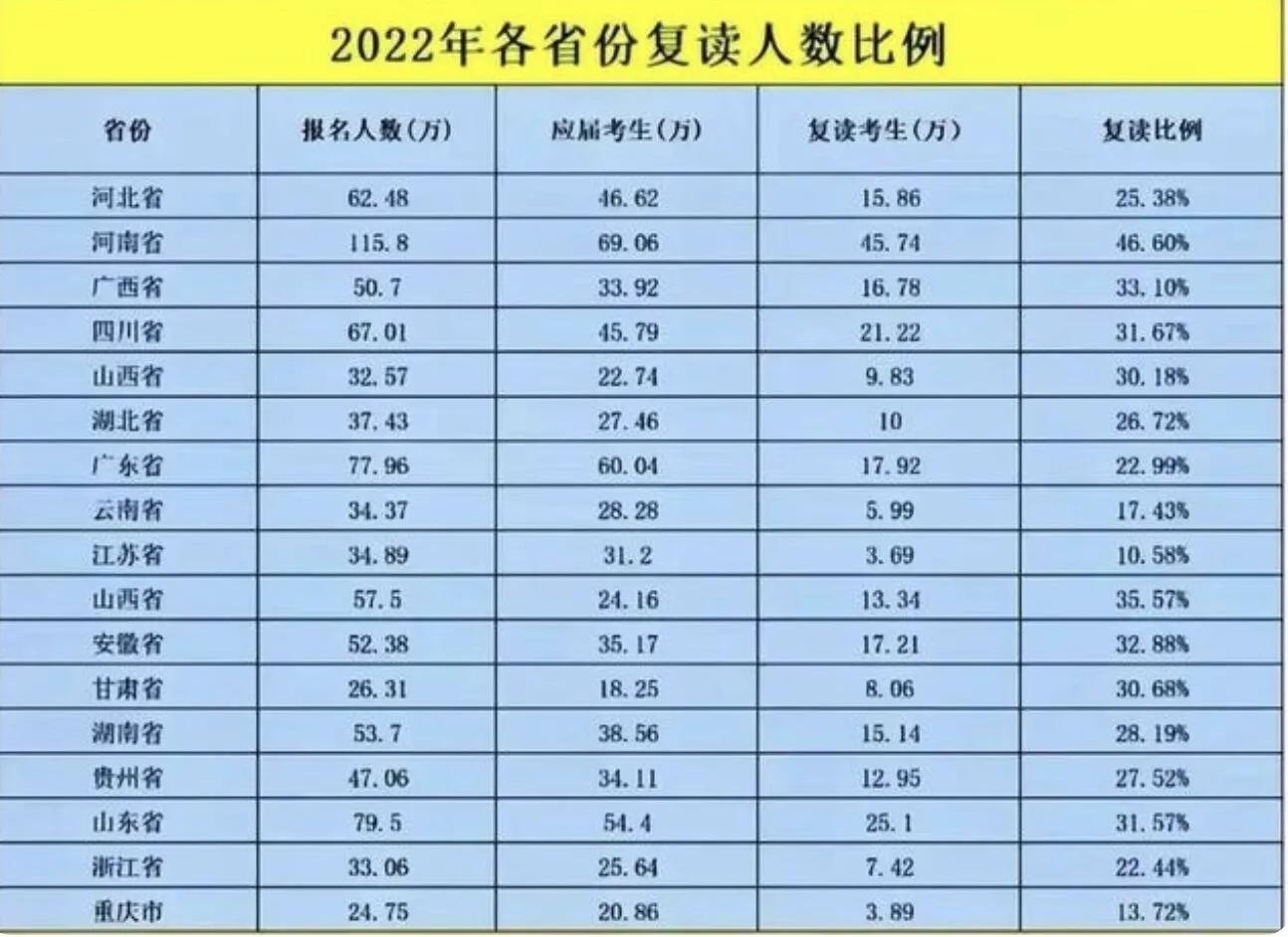 我们可以看到图中平均的复读比例是高达15%以上的,部分省市复读的比例甚至高达46%,也就是接近一半的考生都有复读的经历。