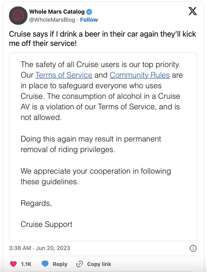因此,Cruise 和 Waymo 喜欢吹嘘他们的汽车永远不会酒后、嗑药或受损驾驶,尤其是 Cruise,它坚持对其摄像头拍到的在车内饮酒的用户进行严厉打击。比如,有一名乘客是热门科技社交媒体账号 Whole Mars Catalog 的作家,他就曾因为在 Cruise 汽车后座上喝了一罐啤酒而受到了 Cruise 公司的书面警告。