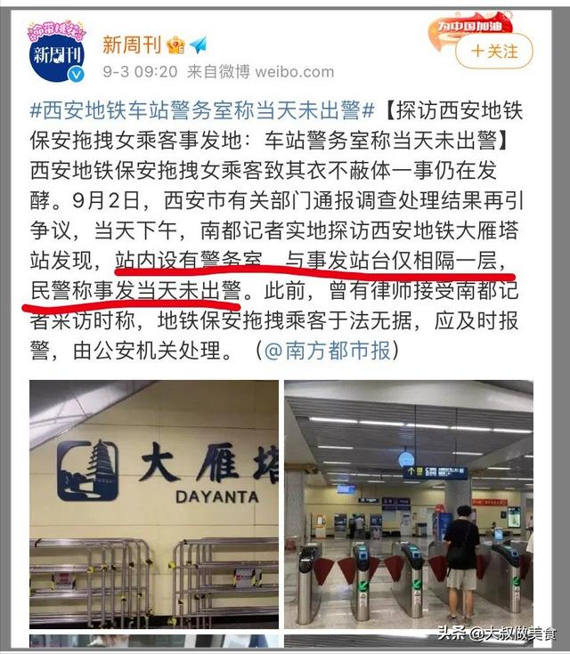 西安地铁运营分公司发布的通报中也写到,17点45分列车到达大雁塔站后,车站工作人员及时报警协助处理。但是根据目前流传的视频来看,并未见到警方的出现,全程都是这名保安在拖拽女乘客,而且大雁塔站警务站就在事发地铁的楼上,一层之隔。