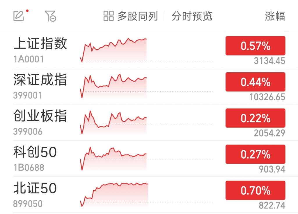 中新经纬 9 月 11 日电 周一,A 股三大指数开盘涨跌不一,此后全部翻红上扬。截至午间收盘,上证指数涨 0.57%,报 3134.45 点;深证成指涨 0.44%,报 10326.65 点;创业板指涨 0.22%,报 2054.29 点。沪深两市所有交易个股涨跌比为 3436:1622,两市涨停 33 家,跌停 4 家。