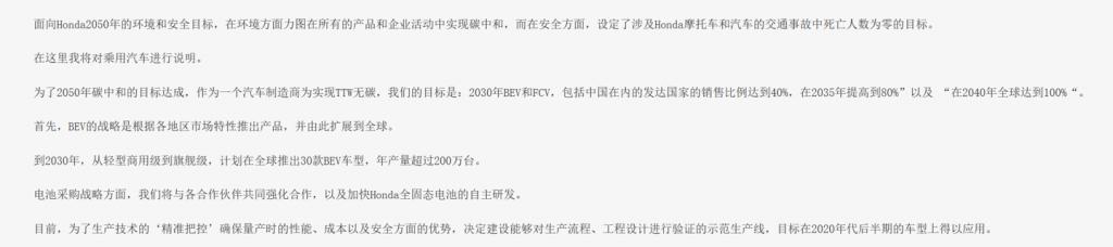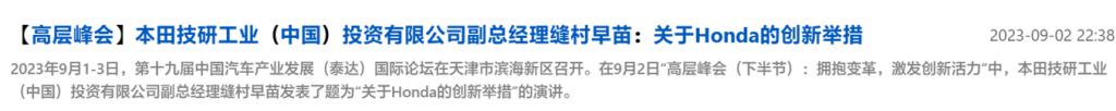 缝村早苗同时声称," 为了中国高标准目标的实现,本田将之前计划的 2030 年停止投放纯燃油车的目标提前 3 年,自 2027 年以后,本田不再投放新型纯燃油车型 "。