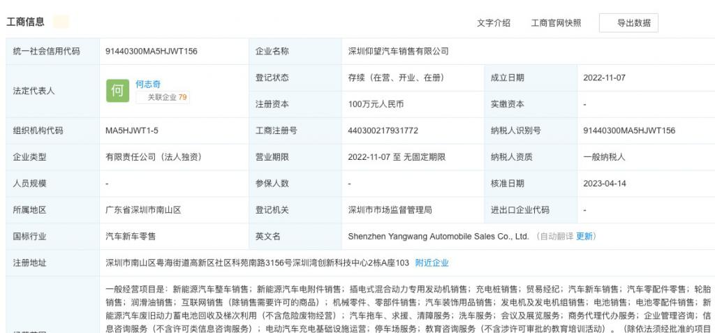 据了解,仰望不仅采用全新的品牌标识,还将采用独立的销售服务网络及运营团队,而仰望品牌的独立销售公司——深圳仰望汽车销售有限公司早于 2022 年 11 月 7 日成立。企查查显示,深圳仰望汽车销售有限公司注册资本 100 万元,法定代表人由比亚迪副总裁何志奇担任,比亚迪 100% 持股。公司经营范围涵盖新能源汽车整车销售;新能源汽车电附件销售;插电式混合动力专用发动机销售;充电桩销售等。