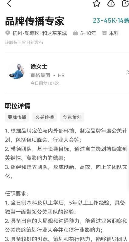 该话题引发广泛关注后,有媒体在招聘平台搜索 " 宜格集团 品牌传播专家 " 等关键词,发现已无法查询到该岗位。