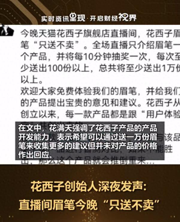此外,据郑州晚报援引搜狐财经报道,9 月 20 日晚,花西子创始人 " 花满天 " 朋友圈发文称,当晚直播间花西子眉笔只送不卖。
