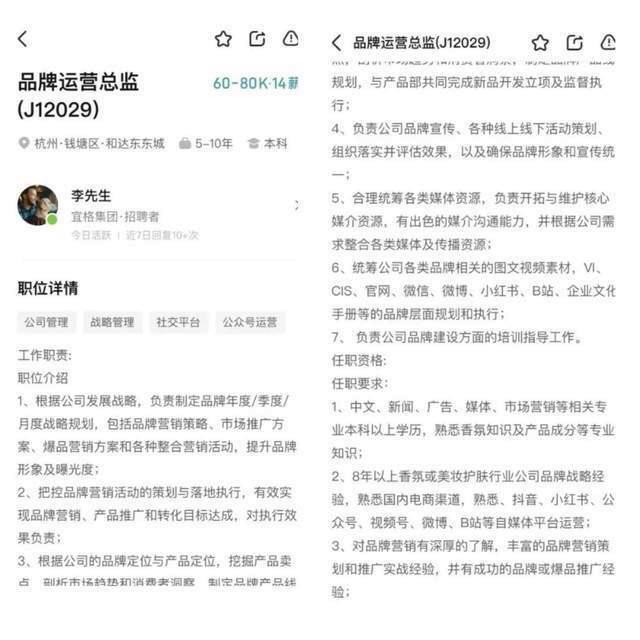 九派新闻发现,在招聘软件上虽然搜索不到宜格集团的 " 品牌传播专家 " 岗位,但能看到品牌运营总监岗位,月薪在 60-80k,按 14 薪计算,年薪最高可达 112 万。