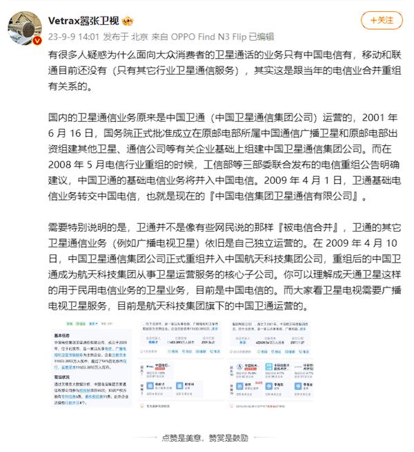 据博主 @三思柯南 ,事情的导火索是最近有新闻称:" 中国卫通在互动平台表示,公司的卫星通信终端与华为 Mate 60 pro 没有合作 ?"