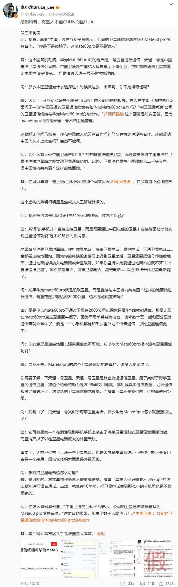 不过近日,一条中国卫通的回应讲华为 Mate 60 Pro 再次推上了风口浪尖,以至于华为高管李小龙都在转发相关科普微博时表示 " 有些人不但 CHUN 而且 HUAI",那么到底发生了什么事?