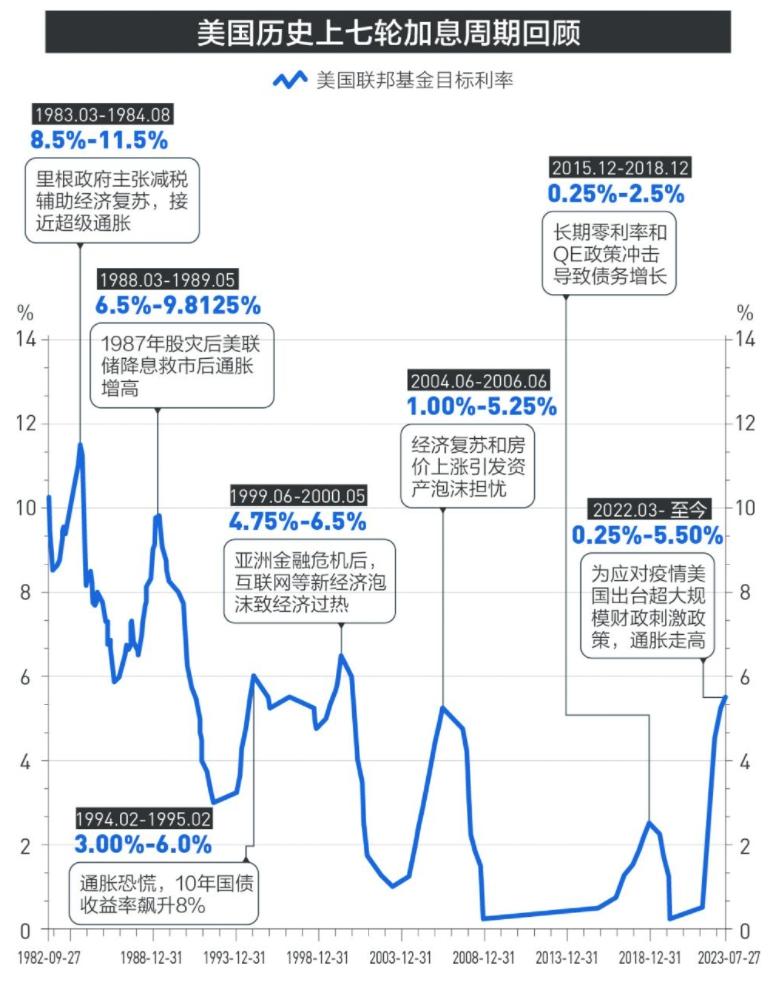 为应对美国高企的通货膨胀,美联储 2022 年 3 月开启本轮加息周期。目前已经 11 次加息,累计加息幅度达 525 个基点,把利率推升到 22 年来的最高水平。