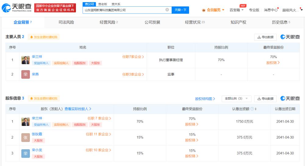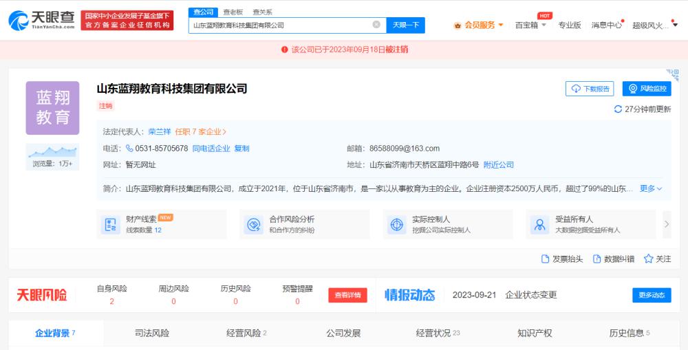 天眼查 App 显示,近日,山东蓝翔教育科技集团有限公司经营状态由存续变更为注销。该公司成立于 2021 年 4 月,法定代表人、执行董事为山东蓝翔技师学院院长荣兰祥,注册资本 2500 万人民币,经营范围含教育咨询服务、企业总部管理、以自有资金从事投资活动等,由荣兰祥、张秋霞、荣小龙共同持股。此前,该公司因未按规定期限公示年报,已两次被济南市天桥区市场监督管理局列入经营异常名录。