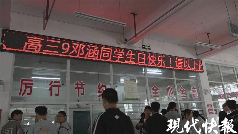 邓涵同学今年就读高三,是阜宁县陈集中学的一名住校生,父母常年在外打工。 10 月 20 日中午 11 点多,邓涵像往常一样,和同学一起到食堂吃饭,看到食堂的显示屏上,打出了 " 祝福高三(9)班邓涵同学生日快乐,请到三楼生日取餐窗口领取一份生日面条 " 的祝福语。" 看到显示屏上打出的字幕,才想起今天是我的生日。" 随后,邓涵同学到三楼的生日取餐窗口,从学校老师手中领取了一份生日面条,并收到生日祝福。此外,当天过生日的还有其他年级和班级的几名同学,大家也一起领取了生日面条和祝福。