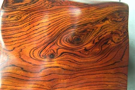 黄花梨心材呈大红、黄褐色和红褐色,木纹较粗,纹理直且较多,从纵切面上看带状长纹明显。