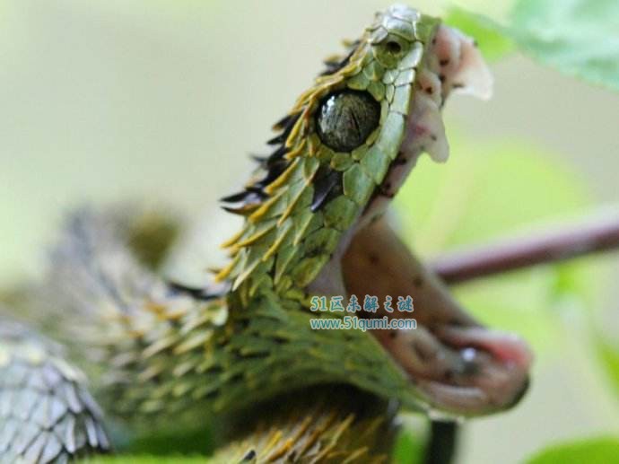基伍树蝰,也被称为毛鳞树蝮、鳞皮树蝮,是蛇亚目蝰蛇科下的一个有毒蛇种,主要分布于中非基伍地区。基伍树蝰的躯体布满了厚长的鳞片,远看就像长满了以鳞片织就的刚硬的"毛发",其头部及颈部附近的鳞片尤为突出。身上的背鳞约有15至19组,腹鳞约有35至64组,肛鳞则仅有1片。有人认为香蛇就是基伍树蝰,但是关于香蛇的科属至今都还是一个未解之谜,国外甚至还有专门的研究机构对香蛇进行研究,香蛇和基伍树蝰还是有区别的。