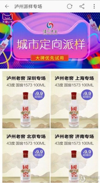 之前天猫试用中心联合泸州老窖做了不少的宣传,主要是针对泸州老窖的目标市场。其中,以洋河区域为重点做活动,最初有1元头曲500ml试用,送20元兑换特曲的券(有高度和低度两种)。那是九月初,最近又做了43° 100ml的国窖试用装推广,主要针对深圳、上海、北京、济南、杭州、广州、无锡、苏州、金华、温州、郑州、大连、武汉、兰州、厦门、东莞、南宁、福州、中山、泉州、重庆、宁波等等。