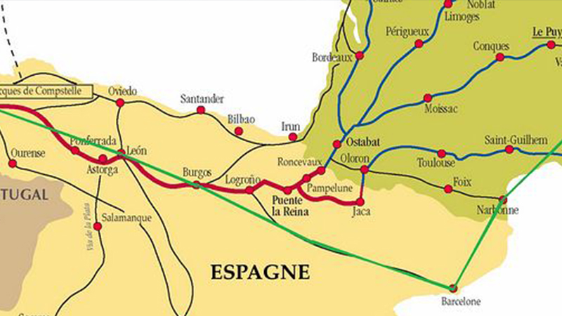 这条已存在上千年的道路,以9世纪时发现圣雅克遗体的圣地亚哥为重点,据说这位遭到谋杀的圣人,在被人以船只从耶路撒冷运送回西班牙北部的途中,船被暴风沉击,当他再度浮出海面时,身上覆盖着保护他的扇贝,因此扇贝成了圣雅克的象征,同时也成为朝圣之路上的路标。
