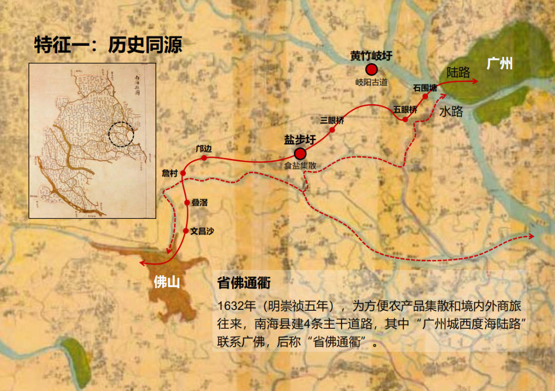 省佛通衢东起广州秀水墟,经过亨漖村到广济桥,再经三眼桥,行经今天的盐步医院,再穿过盐步直街,经过霍边村等村庄,最后拐入禅城就能到达佛山古镇。其时,沿线茶楼林立、商贾不绝。