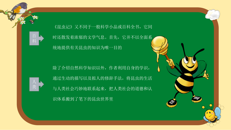 年复一年,他守着心爱的荒石园,开足生命的马力,不知疲倦地从事独具特色的昆虫研究,把劳动成果写成一卷又一卷的《昆虫记》。