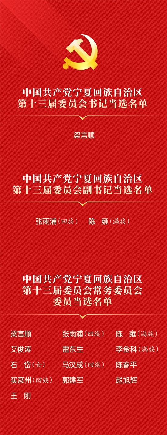 梁言顺、张雨浦、陈雍、艾俊涛、雷东生、李金科、石岱、马汉成、陈春平、买彦州、郭建军、赵旭辉、王刚当选为自治区党委常委,梁言顺当选为自治区党委书记,张雨浦、陈雍当选为自治区党委副书记。(宁夏日报记者 马晓芳 姜璐)