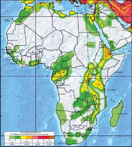 非洲的地震远远少于其他大陆。在撒哈拉大部分地区和非洲大陆中部几乎没有任何地震活动。但在黎巴嫩范围内的东地中海沿岸(阿拉伯斑块与欧亚和非洲板块相撞区域)存在地震的风险。