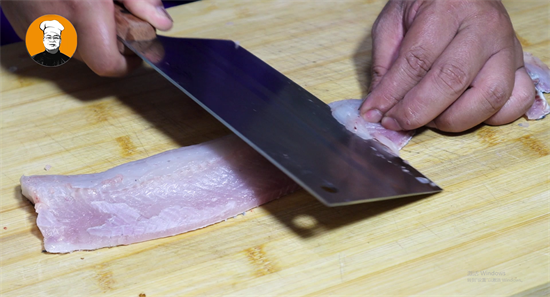 4、处理干净的黑鱼剪去鱼鳍,斩下鱼头,沿着鱼龙骨削下鱼肉,再片去内刺,片成鱼片,摆在流水底下冲十分钟,冲去鱼片的血水