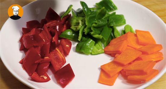5、生姜、胡萝卜切片备用。青红椒去蒂去籽切菱形斜片。小碗中放入少许食盐、一勺白糖、生抽、蚝油、料酒、少许白胡椒粉、鸡汁、清水、淀粉搅拌均匀备用