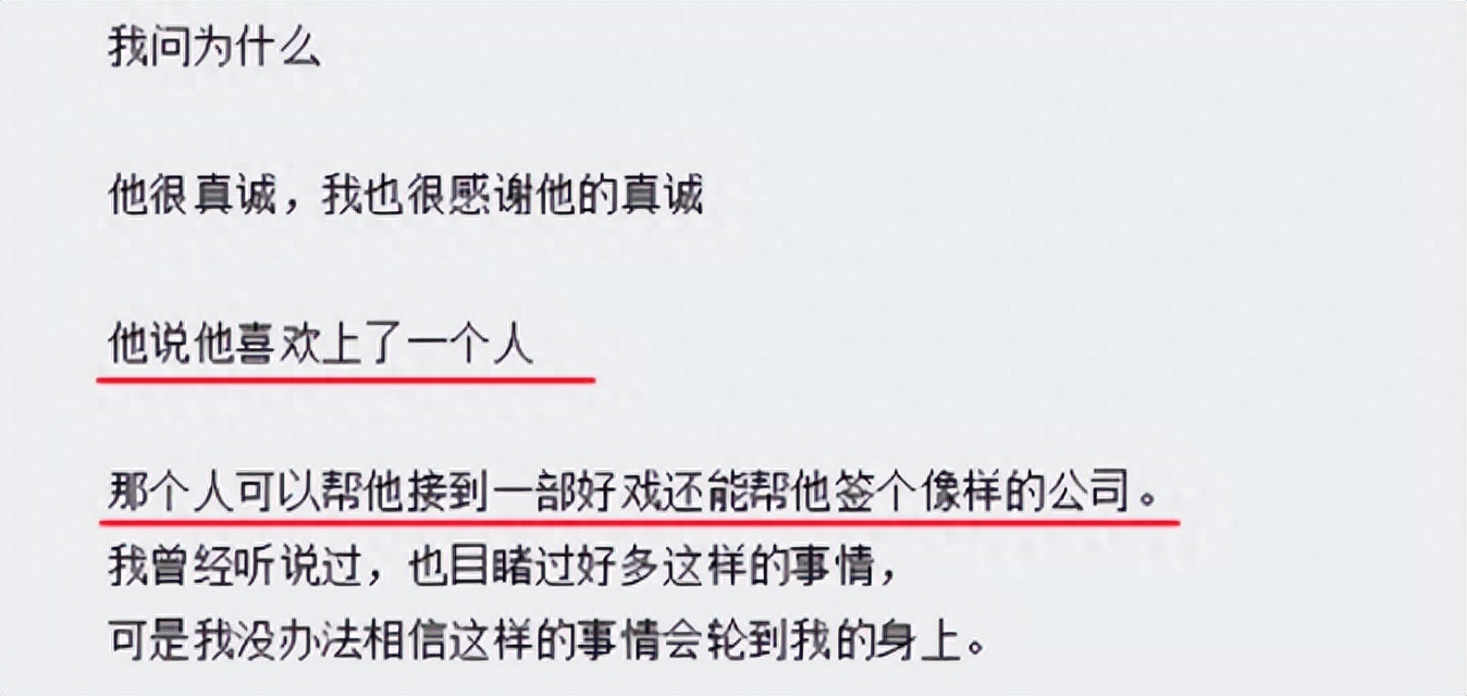 几个月后,男友向她提出分手,原因是他喜欢上了另一个人,而且这个人能帮他“接到一部好戏、签个像样的公司”。