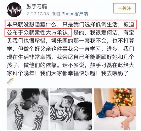 没过多久,刁磊发文晒娃,同时也承认了他与何洁结婚的消息。距离何洁在节目里说“再也不结婚”才过了两年不到,自打脸未免来得太快。